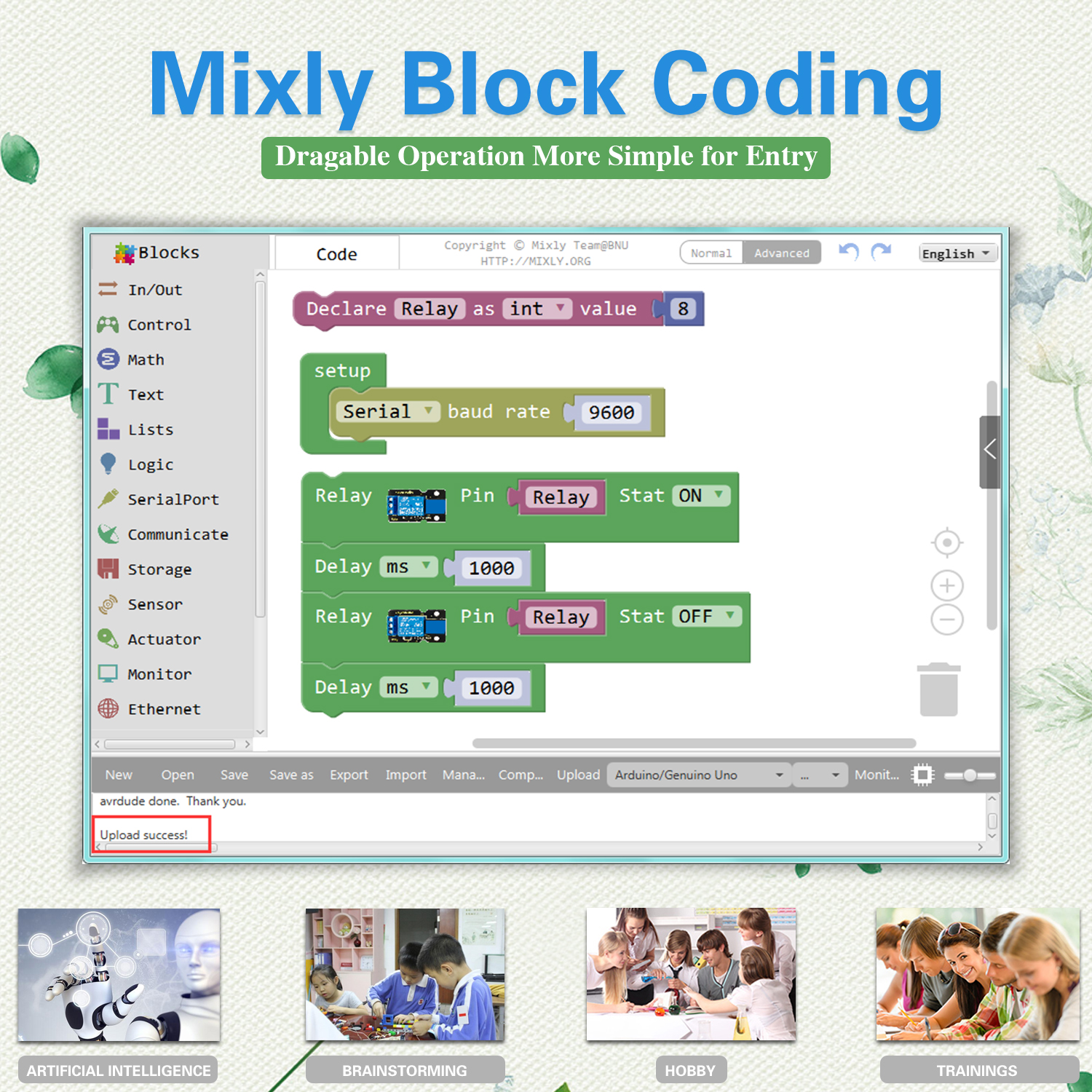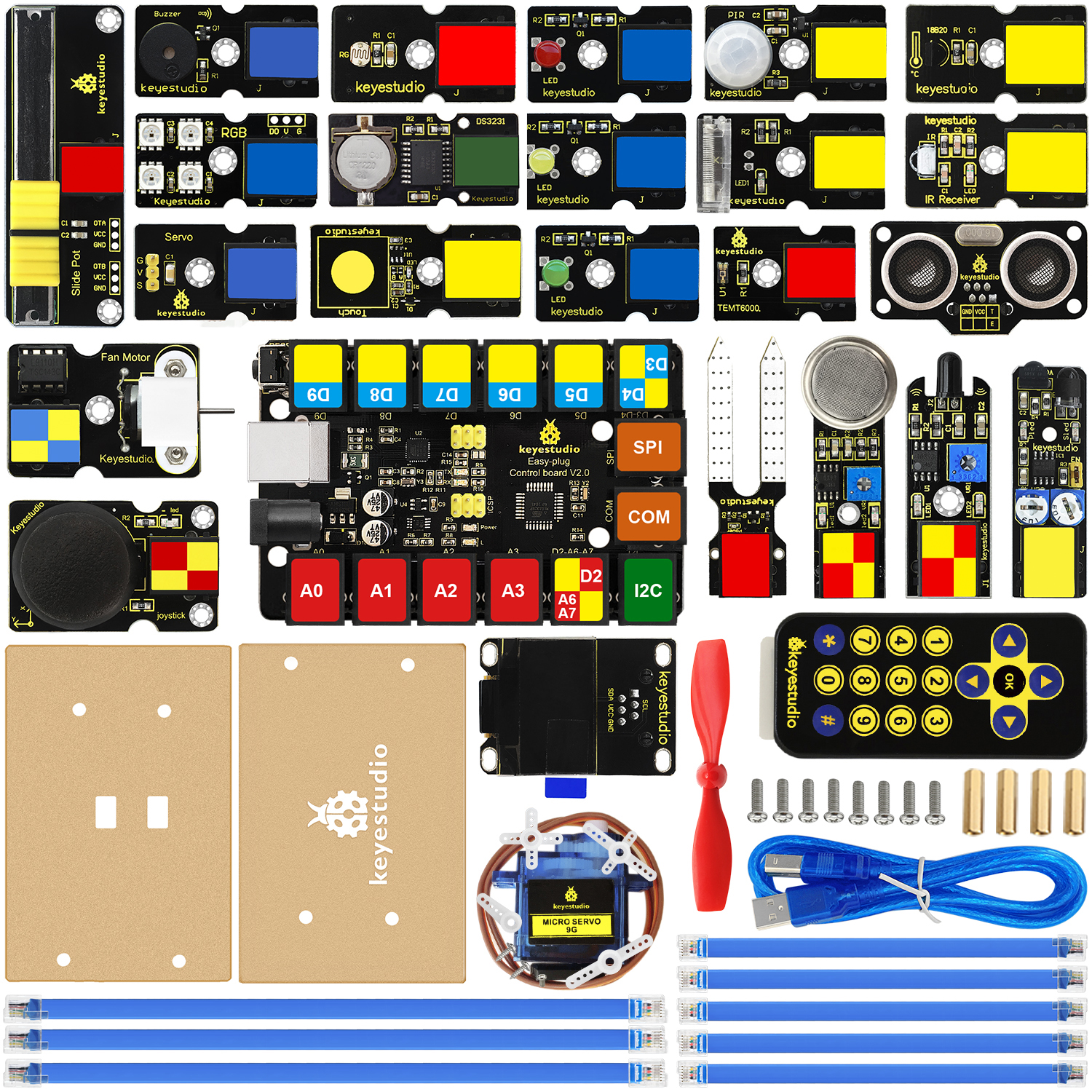 The keyestudio EASY PLUG ultimate starter kit is based on Mixly blocks coding, very easy to use and flexible.