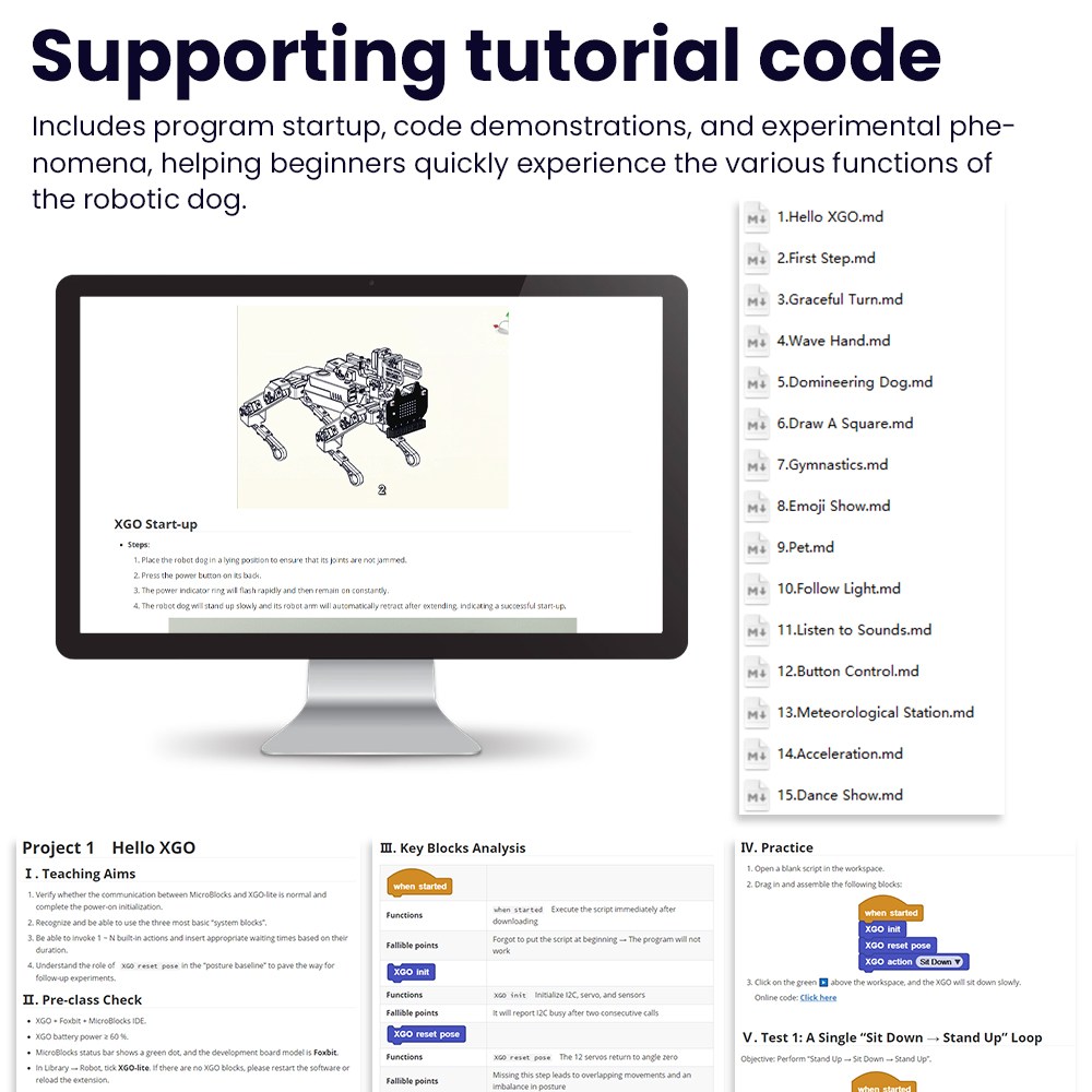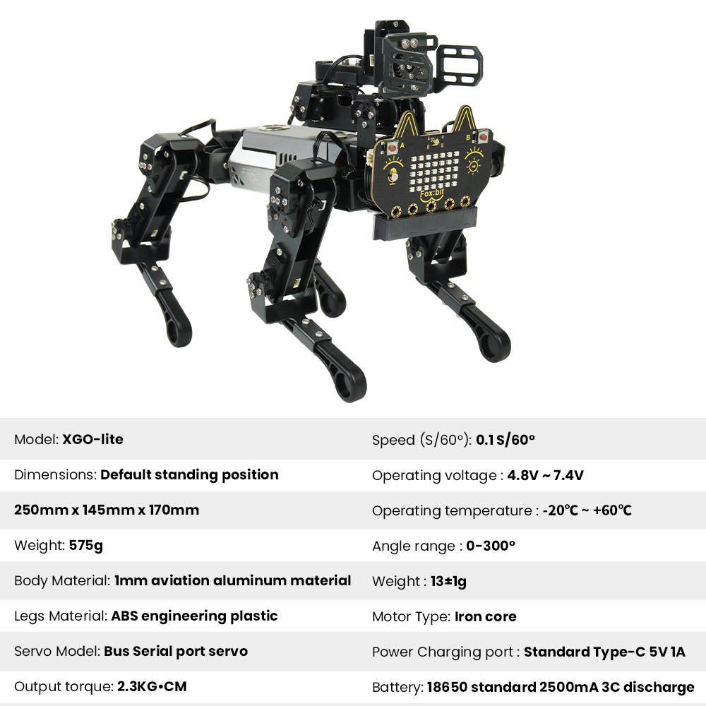 XGO-lite is an outstanding desktop AI robot dog. It is designed to meet the needs of various applications, especially in the fields of education, programming, robotics, and intelligent control. This robot dog integrates advanced sensors and a fine mechanical structure, so it is able to perform complex motion and operation tasks. The equipped Foxbit control board provides it with powerful control capabilities, allowing users to carry out secondary development or customize functions through various programming methods.