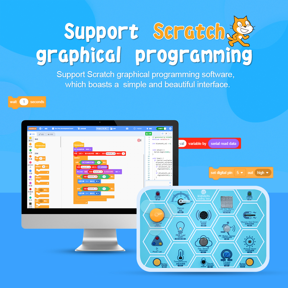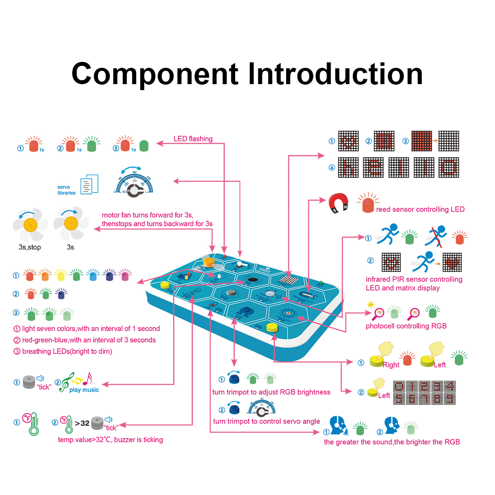 Besides, multitudes of interesting projects can be carried out via the Coding Box, including LED flashing, intrusion alarms, smart fans as well as temperature testers.